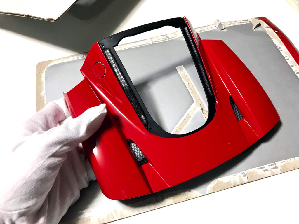 エンジンフードを取り出します。外装パーツは指紋が付くのが嫌なので白手袋(59号付属)をはめて作業します。